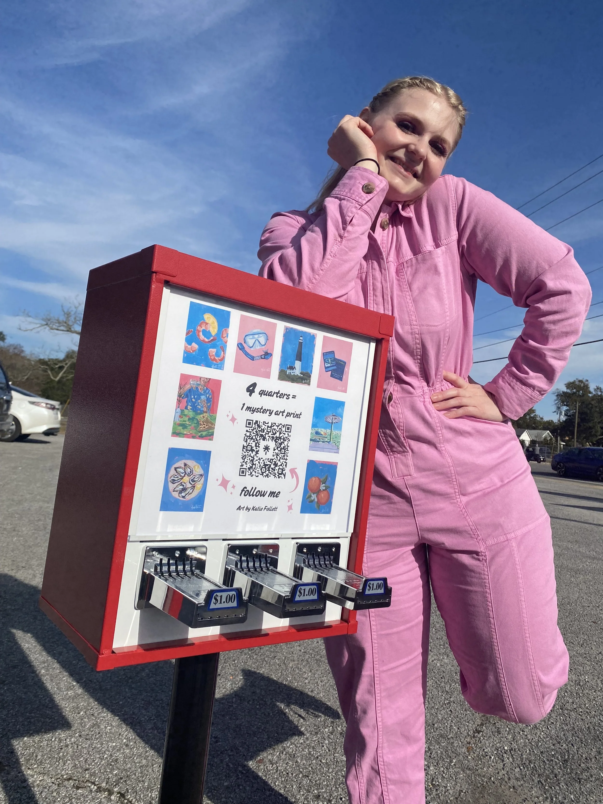 Indy travels around the Florida panhandle, spreading joy and making art accesible. For four quarters you will get a miniature art print of an original piece by Katie Follett.